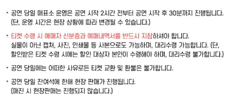 - 공연 당일 매표소에서 신분증 및 예매 내역 확인 후 수령