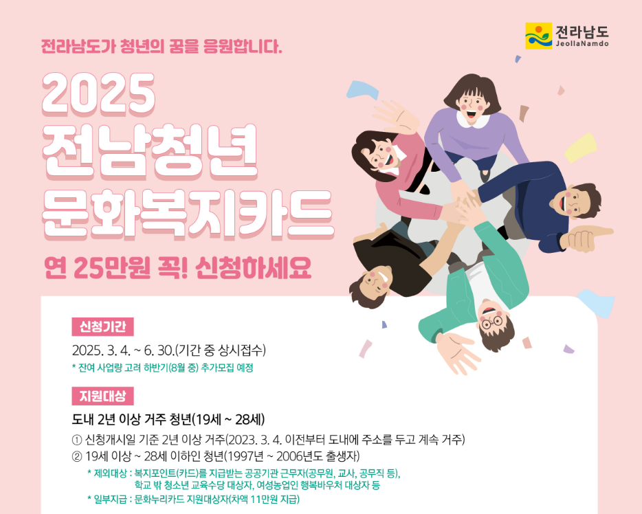 전라남도 거주 청년이라면? 연 25만원 지원되는 문화복지카드를 놓치지 마시고, 신청을 고민 중이라면, 늦기 전에 서둘러 신청하셔서 혜택보시기 바랍니다.