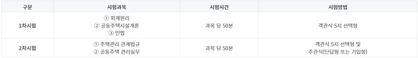 2차 시험과목은 주택관리 관계법규, 공동주택 관리실무 총2과목이며 5지 선다형 24문항, 주관식 16문항이 출제됩니다.